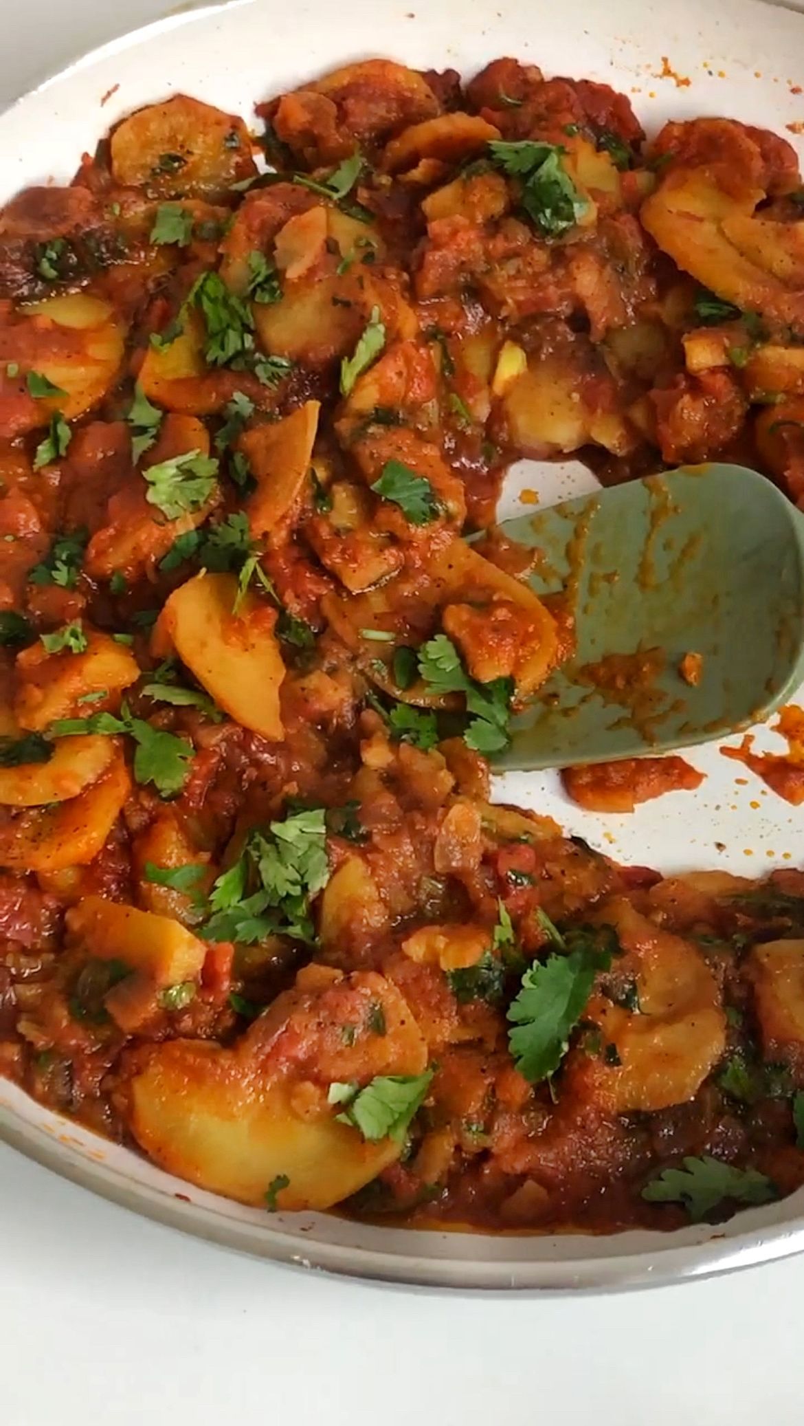 - Fertigstellen: Sobald die Kartoffeln schön weich sind, den frischen Koriander unterheben. Alles noch etwa 5 Minuten bei niedriger Hitze köcheln lassen, bis die Sauce dickflüssig ist und kein überschüssiges Wasser mehr vorhanden ist.