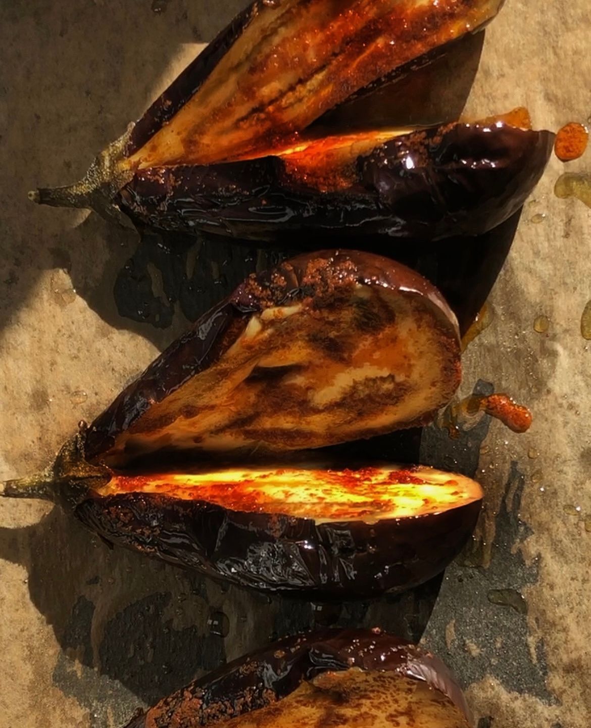 - Finishing the Eggplants: Take the eggplants out of the oven, cut them lengthwise, and generously brush them with the harissa glaze. Return them to the oven for another 10 minutes.