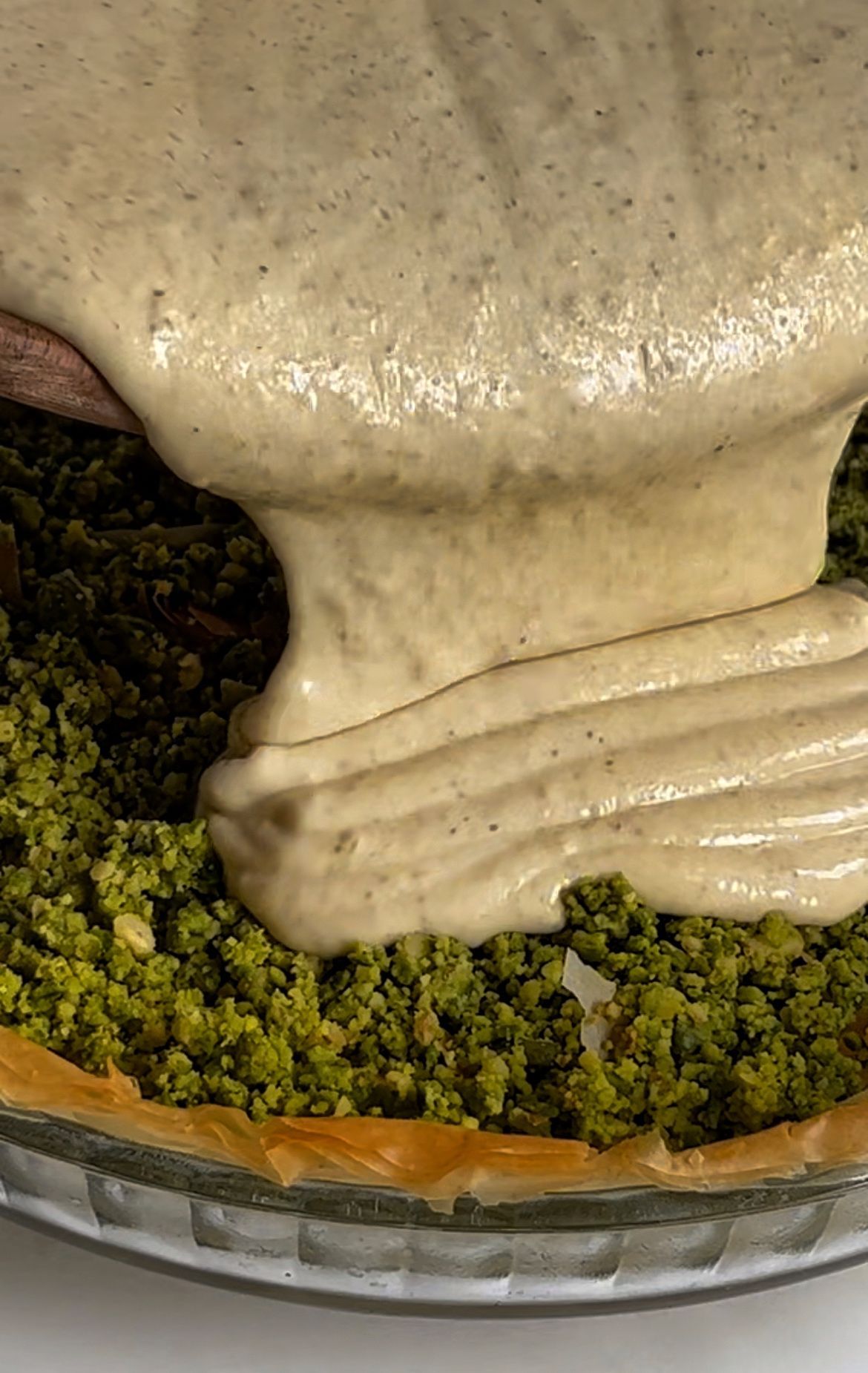 - Spread the filling: Evenly spread the nut mixture over the phyllo dough base and pour the filling on top. Smooth it out.