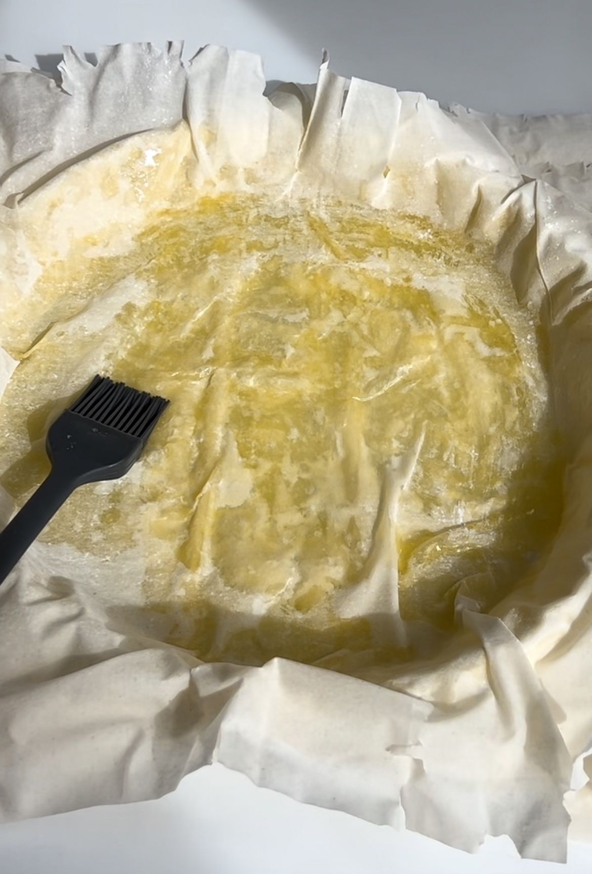 - Prepare the phyllo dough: Grease a cake pan with melted butter and place a layer of phyllo dough inside. Brush each layer with butter and repeat the process. Cut off any overhanging dough, crumble it, and distribute it on the bottom.