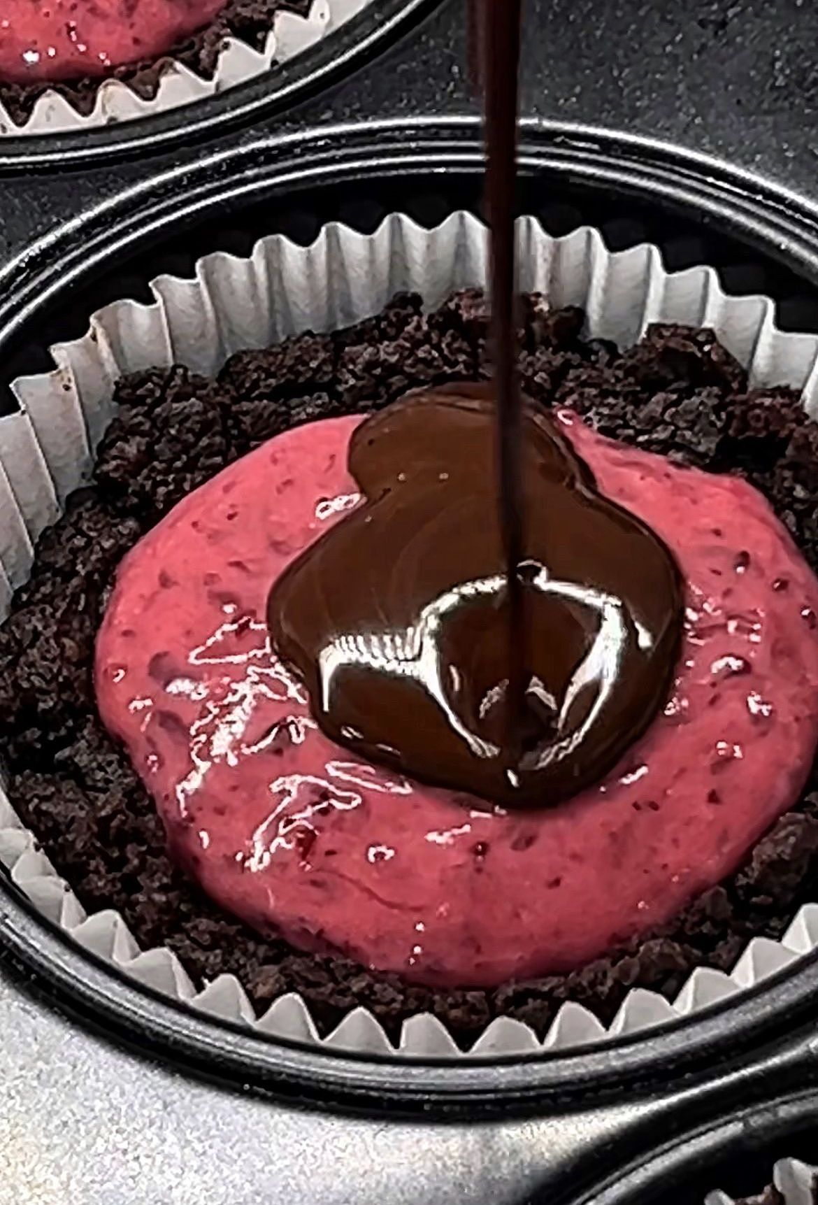- Melt the chocolate: Melt the dark chocolate and coconut oil in a water bath or microwave. Then, place about 1 teaspoon of the berry filling on each brownie and drizzle with about 1 ½ teaspoons of melted chocolate.