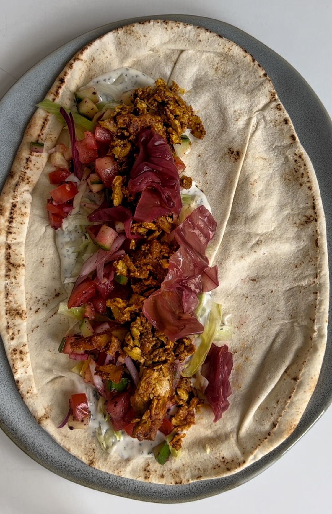 6. Fill the wrap: Spread the yogurt sauce on the Arabic pita bread. Then layer the shredded iceberg lettuce, tomato salad, spiced tofu, and pickled red cabbage on top.