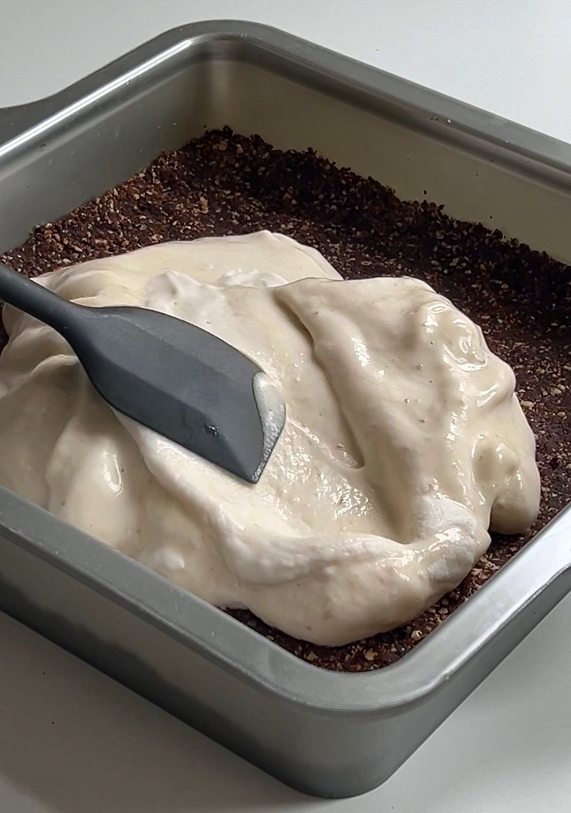 - Make the filling: Blend frozen banana and coconut cream until smooth and creamy, then spread over the base.