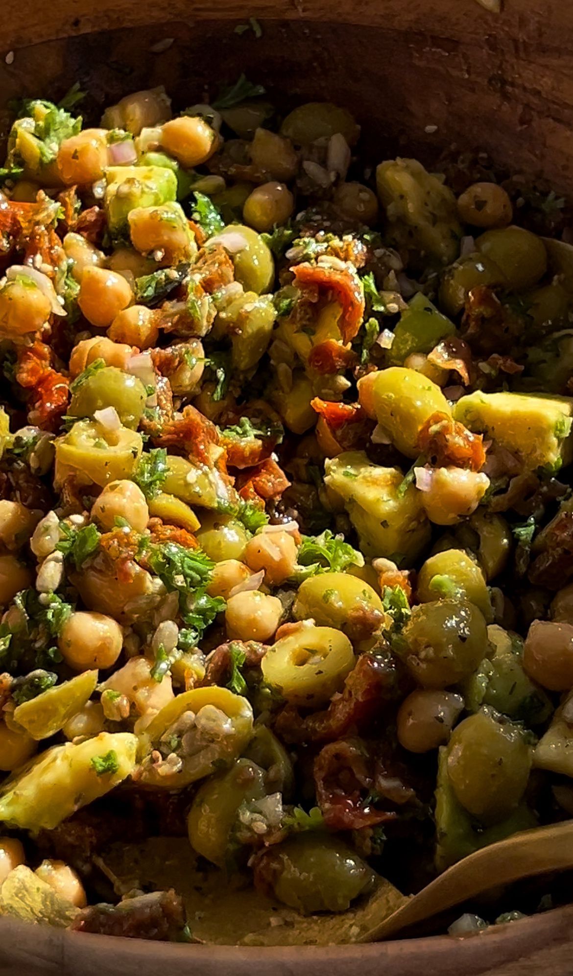 At the heart of it are chickpeas – light yet hearty – perfectly complemented by briny green olives and flavourful sun-dried tomatoes. Creamy avocado adds a smooth contrast, while shallots give the dish a subtle sharpness that ties everything together beautifully.