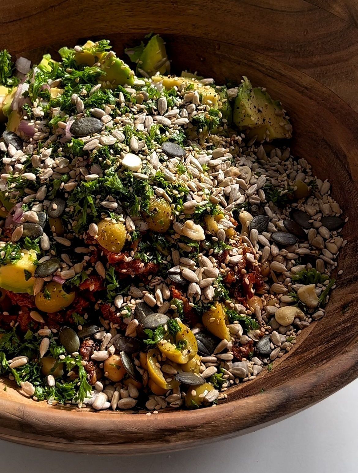 - Season and mix: Add the sun-dried tomato oil, lemon juice, salt, pepper, and the salad nut mix. Give everything a good stir.