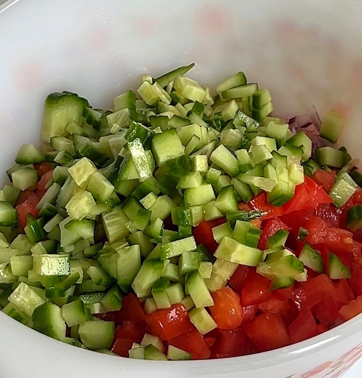 - Preparation: For this salad, all ingredients are diced into very small cubes – the finer, the better.