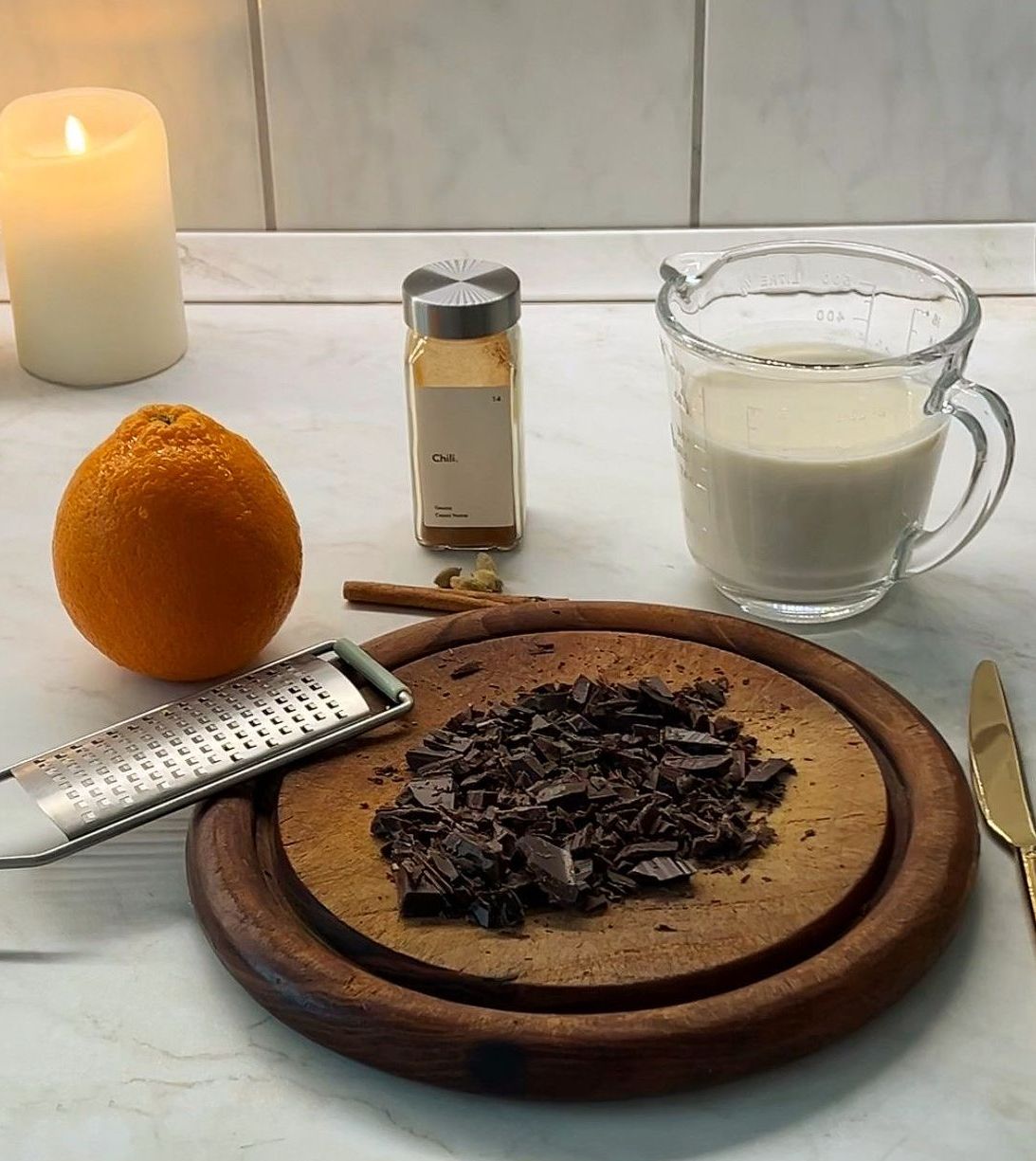 My recipe for a cup of hot chocolate combines orange, high-quality dark chocolate, and warm, aromatic spices like cinnamon, cardamom, and a pinch of chili.
