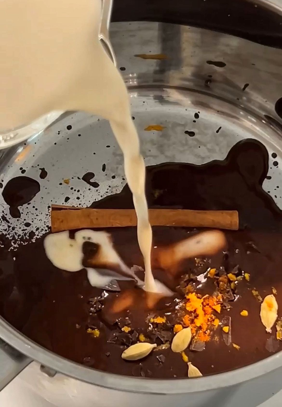 Gently crush the cardamom pods and add them along with the cinnamon stick, chili powder, and a pinch of salt to the chocolate.