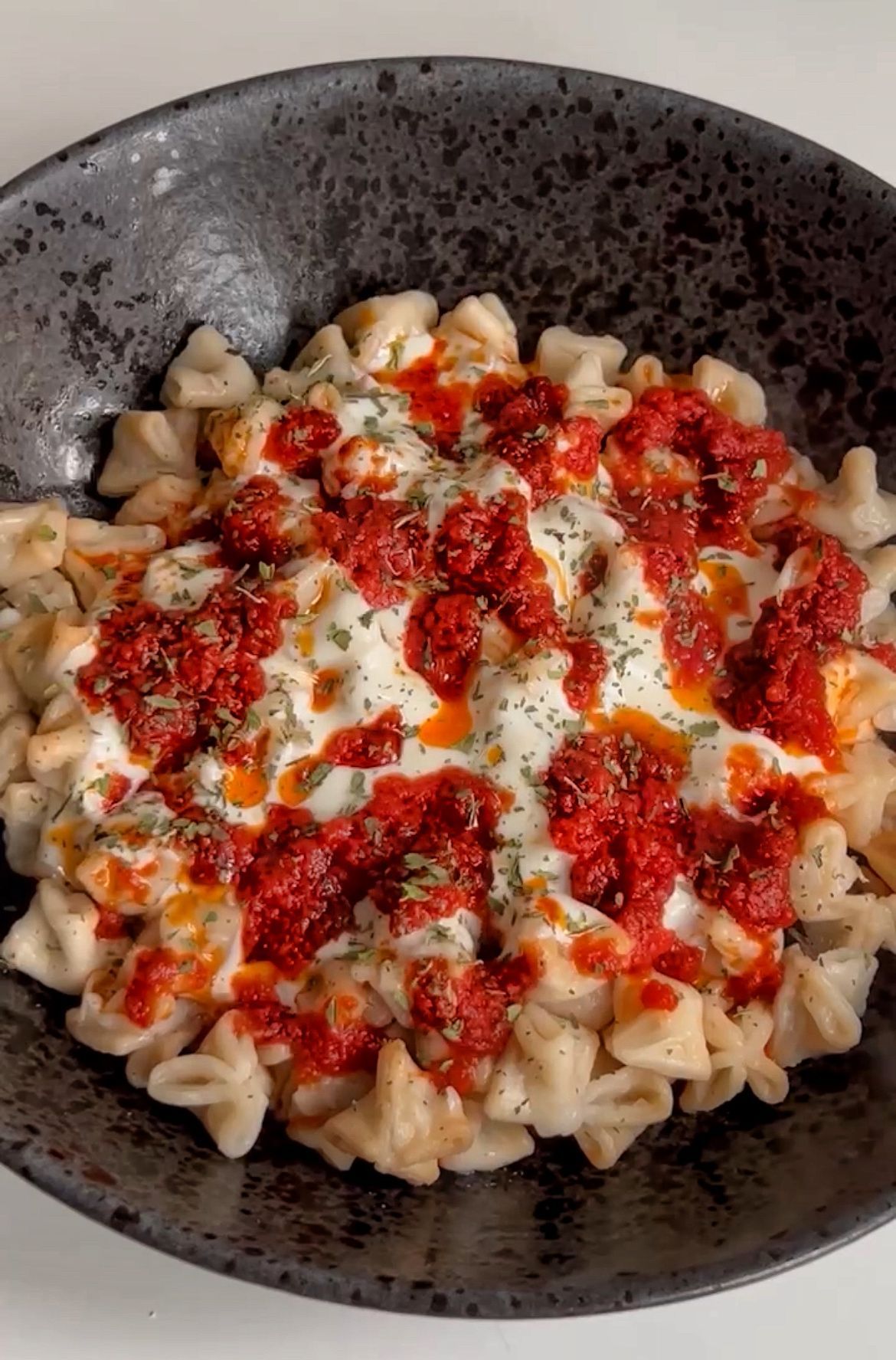 - Plate the Manti: Drain the Manti and arrange them on a plate. Spread the yogurt dip evenly over the Manti and top with the hot tomato sauce.