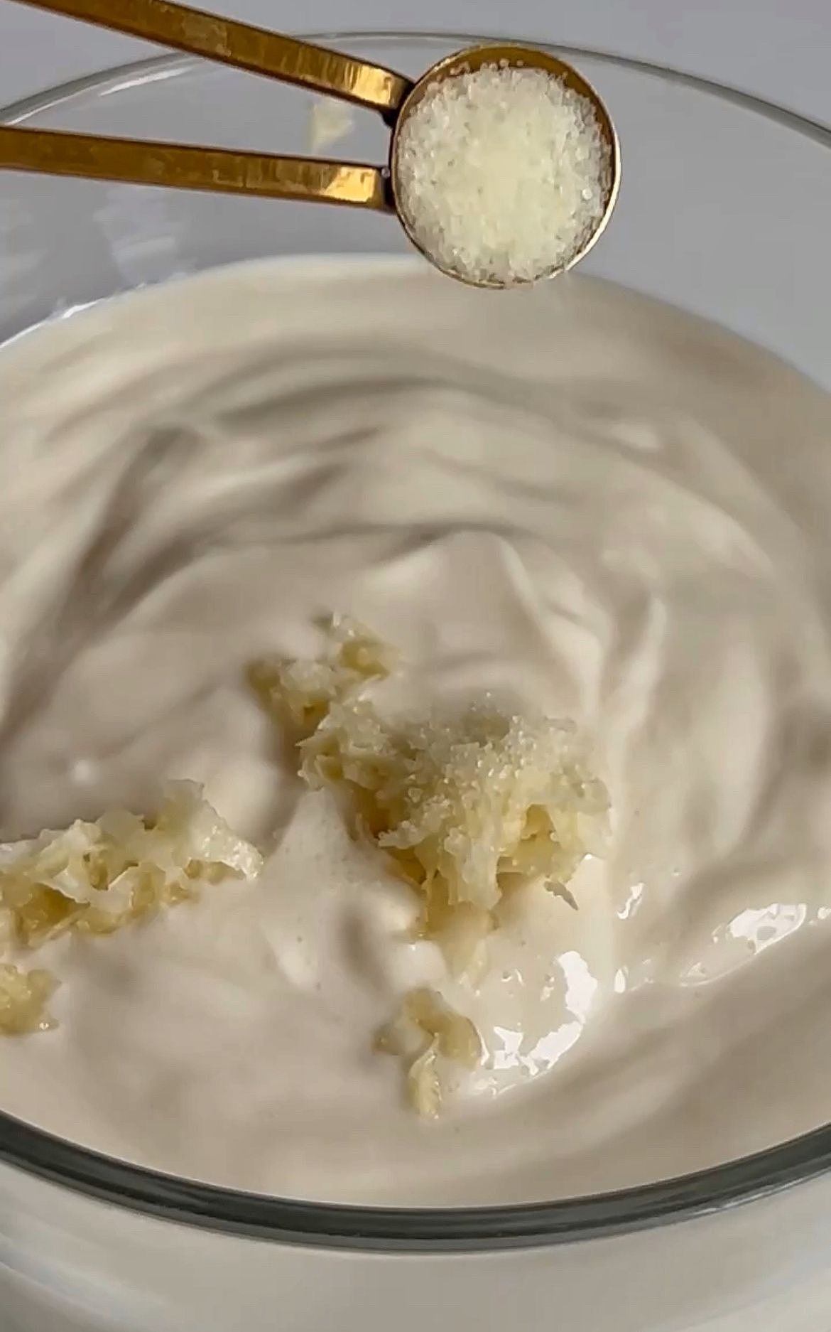 - Prepare the yogurt dip: Mix the unsweetened soy yogurt with the crushed garlic clove and salt. Stir well until the dip is creamy and evenly seasoned.