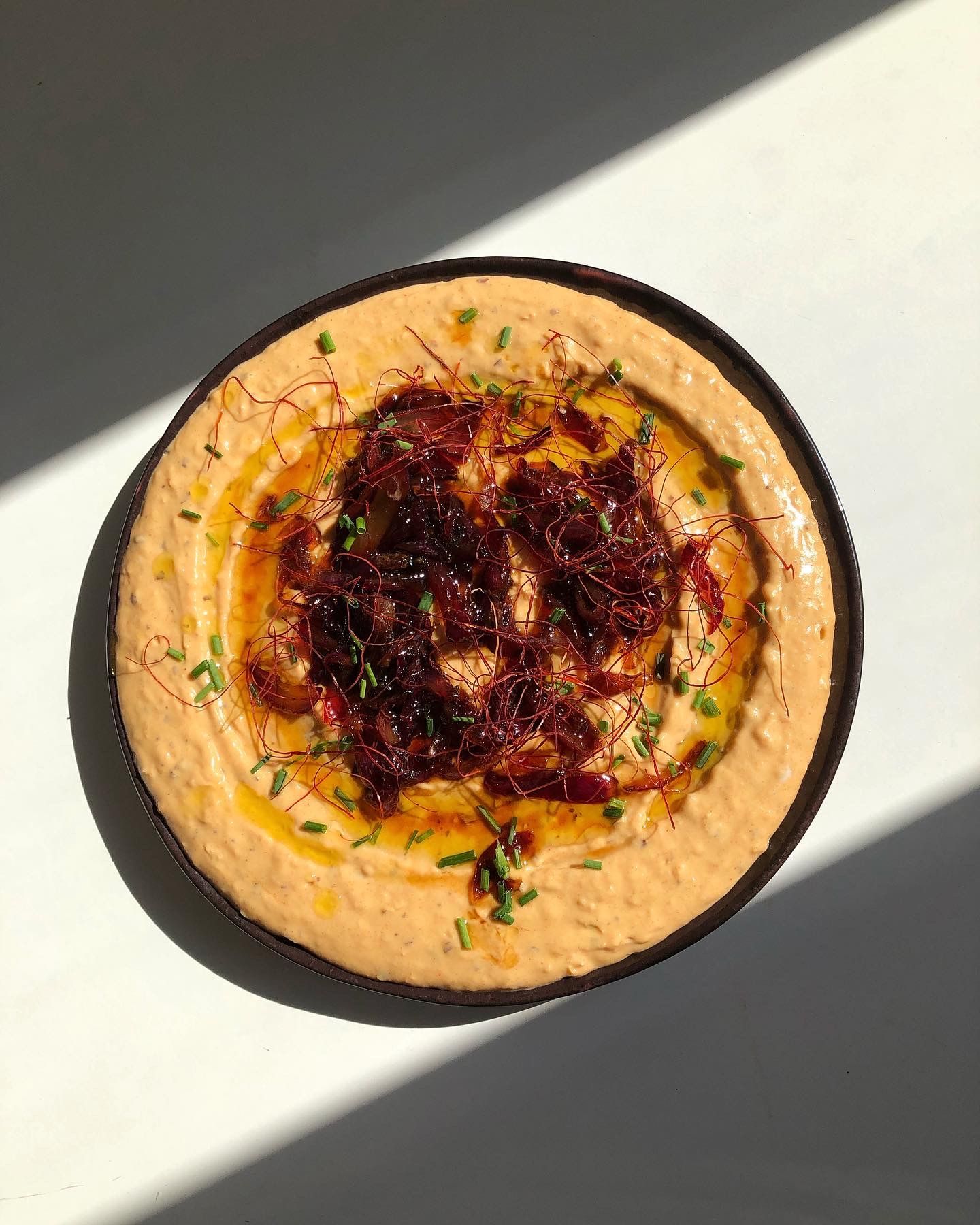 - Anrichten: Den Dip auf einem Teller gleichmäßig verteilen und die karamellisierten Zwiebeln in der Mitte platzieren. Mit frischem Schnittlauch bestreuen, ein wenig Olivenöl drüber träufeln und mit Chilifäden garnieren – fertig. Jetzt heißt es genießen!