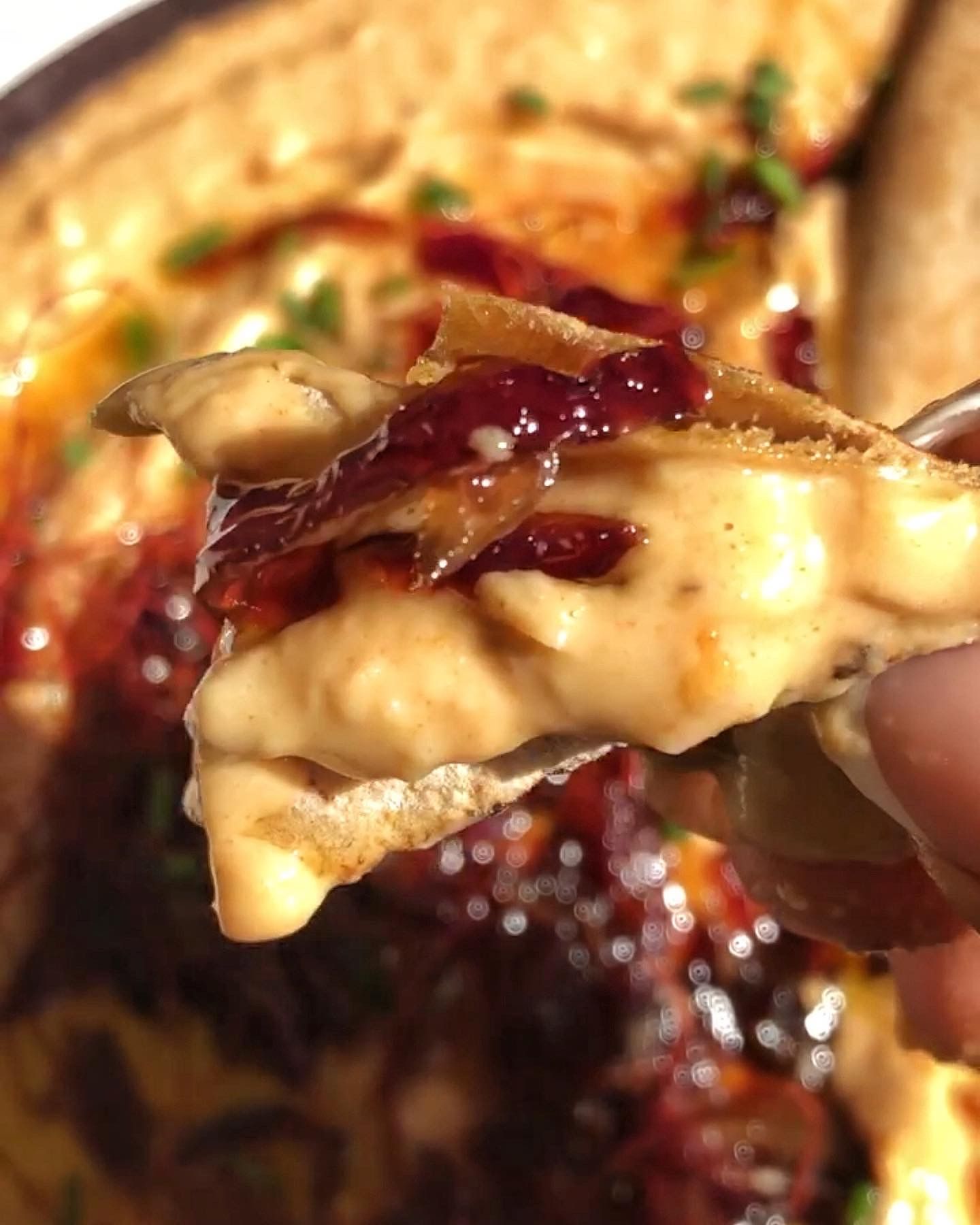 Was diesen Dip wirklich herausstechen lässt, sind die karamellisierten Zwiebeln und die Chilifäden, die nicht nur geschmacklich hervorstechen, sondern ihn auch optisch zum Hingucker machen. Dieser Dip ist ein tolles Beispiel dafür, wie äußere und innere Schönheit zusammenkommen können – er sieht genauso gut aus, wie er schmeckt.