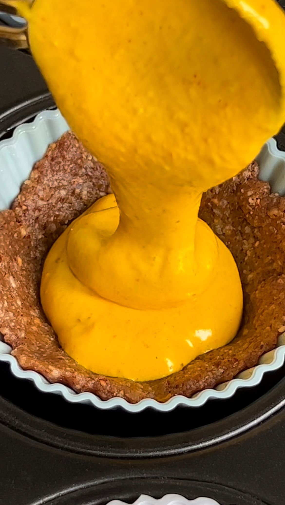 7. Füllung verteilen: Die Safran-Cashew-Creme gleichmäßig auf den Böden verteilen. Für jede Portion etwa 1½ Esslöffel der Creme verwenden.